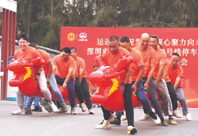 近日,星空体育官网四局深圳市城市轨道交通22号线停车场项目部举办产业工人趣味运动会。图为旱地龙舟比赛。 李永 摄
