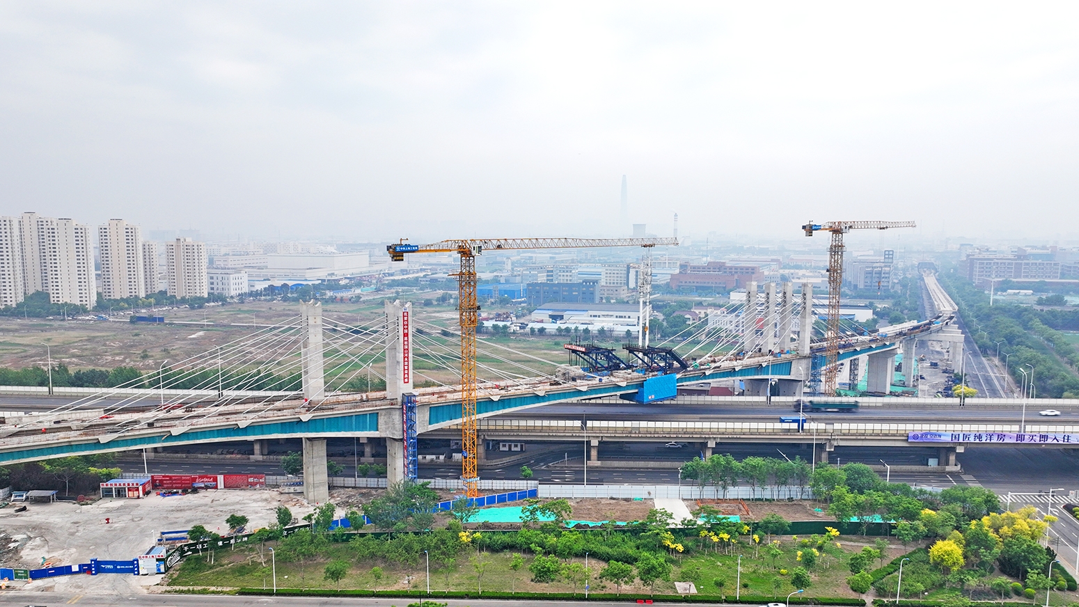 该桥位于天津市滨海新区,上跨京津高速、集疏港公路,采用左右线独立单桥设计,跨径布置分别为左线(76+140+124+62.5)米、右线(81+148+70+34)米。主桥为波形钢腹板混凝土结合箱梁,桥塔采用塔梁固结形式钢筋混凝土结构,梁面以上主塔高23米。采用双索面、单侧组对拉索,左、右线共设32组斜拉索。桥梁节段波形钢腹板安装难度高,拉索预埋及分丝管索鞍安装定位精度要求极高,为全线控制性重点工程。
