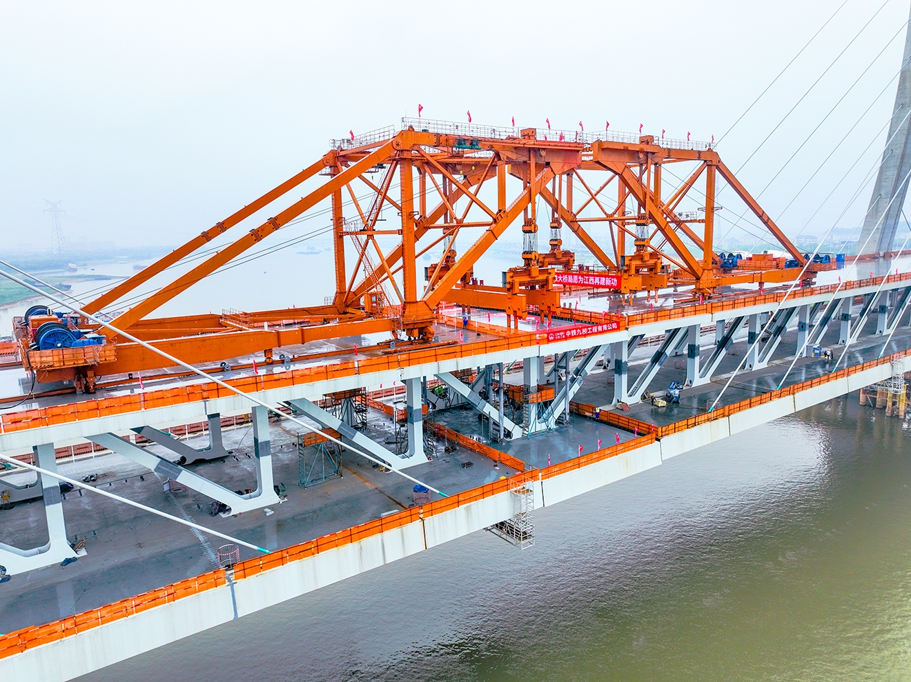 赣江西支主桥采用“竖琴型索面钢箱桁组合梁斜拉桥”设计,全长702米,主跨320米。主梁为强箱弱桁的箱桁组合结构,两片“N”形主桁,标准节间长16米,共45个节段,单节最重达到958吨,全桥钢箱桁梁总重约为3.41万吨,规模与施工难度均居国内同类桥梁前列。星空体育九桥主要承接赣江西支主桥南昌侧23个节段约1.72万吨钢结构的制安任务。