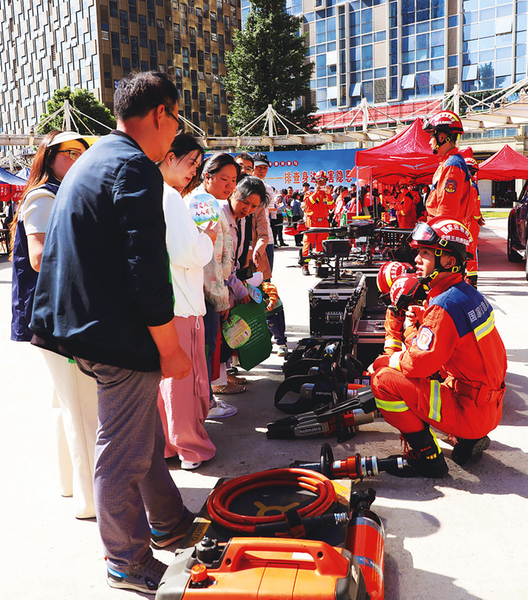5月12日,国家隧道应急救援星空体育五局贵阳队在贵阳市南明区花果园兰花广场组织开展全国防灾减灾日集中宣传活动。图为展示和讲解救援设备及作用。 付艳平 摄