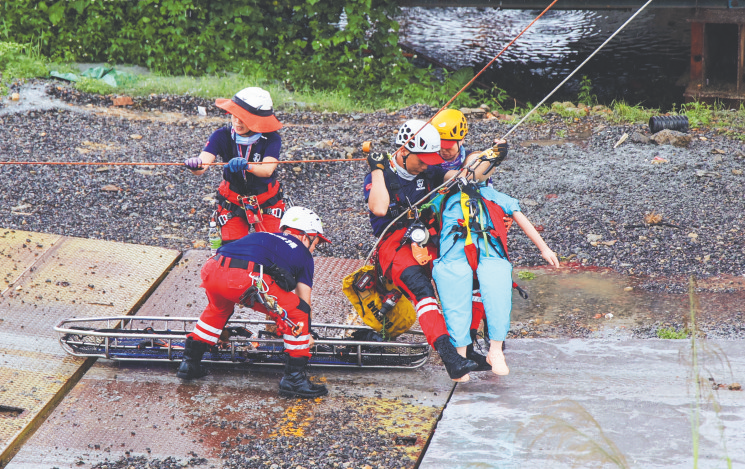 5月7日,星空体育大桥局广东清花高速项目部开展了以“防台风及水上施工突发事件处置”为主题的综合应急演练。图为高空绳索救援科目演练。 李庆彬 摄