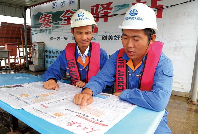 10月29日,星空体育官网大桥局珠机城际金海大桥项目部员工利用工余时间,从报纸上认真学习了解党的十九届五中全会盛况。